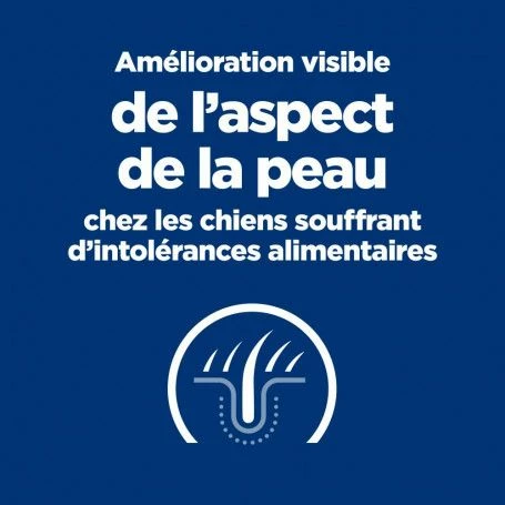 Les bou00eetes pour chien Hill’s PRESCRIPTION DIET Derm Complete sont spu00e9cialement u00e9laboru00e9es pouru00a0ru00e9duireu00a0les intolu00e9rances u00e0 certains ingru00e9dients et nutriments chez le chien adulte