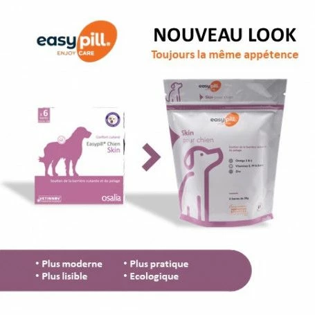 Easypill Skin Chien, aliment complu00e9mentaire tru00e8s appu00e9tent, amu00e9liore le confort cutanu00e9 chez le chien gru00e2ce u00e0 sa formule qui contient des Omu00e9ga 3, des Omu00e9ga 6, du zinc,u00a0 de la vitamine PP, de la vitamine E et de la biotine.