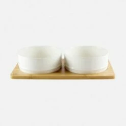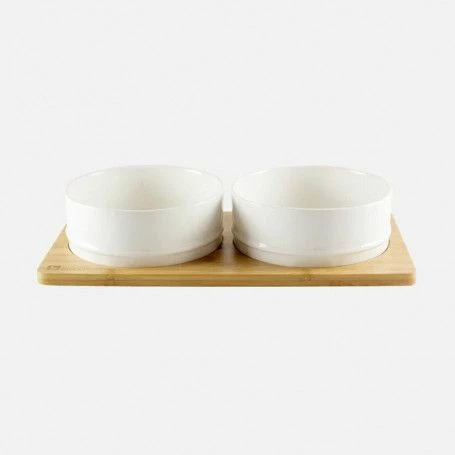 Ambiance tru00e8s nature avec ces superbes bols en cu00e9ramique, avec jolie empreinte patte au fond des bols, sur plateau en bambou avec pieds antidu00e9rapants.